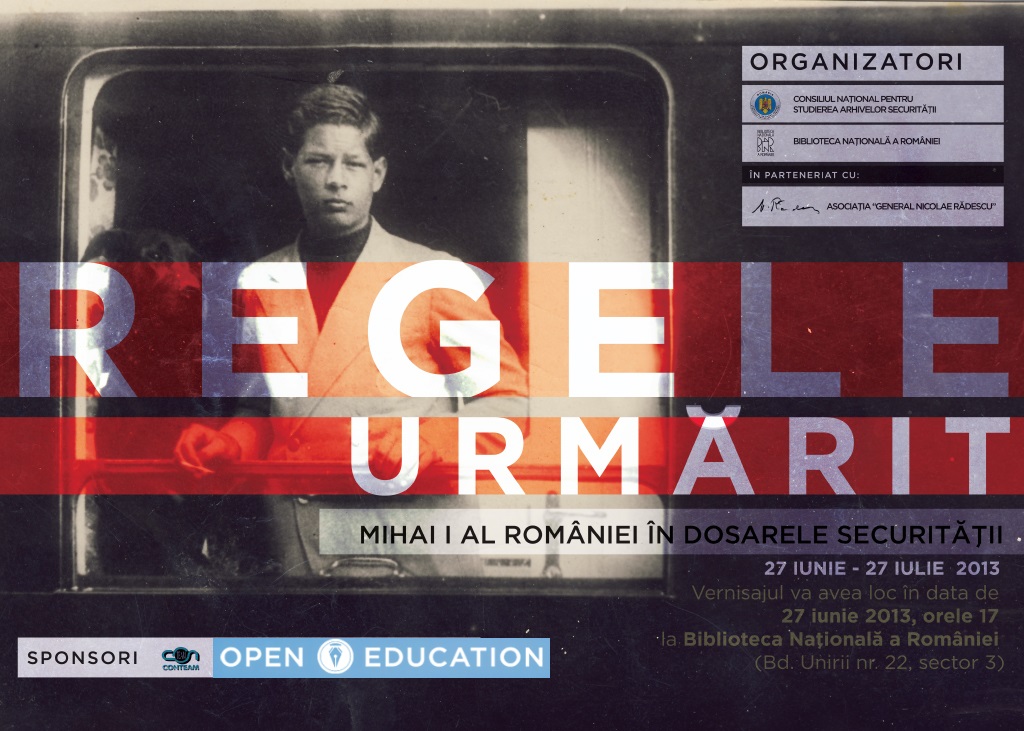 The National Council for the Study of The Archives of the Securitate (state security services) announces the opening of the exhibition "The Pursued King. Michael I of Romania in the files of the state security services", which will be held on Thursday, June 27 2013, 17 p.m., in the central exhibition place in the new headquarters of the National Library of Romania (B-dul Unirii, no. 22, sector 3, Bucharest).